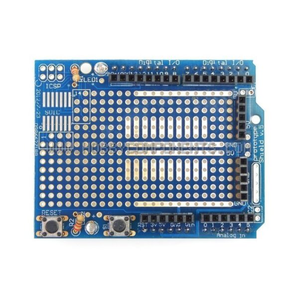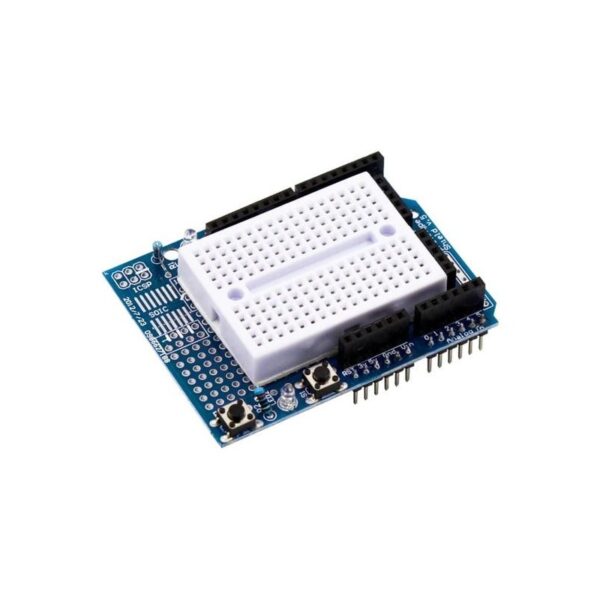 This proto shield for Arduino allows you to conveniently build circuit prototypes either by using the solderless breadboard or by soldering components on the prototyping board.