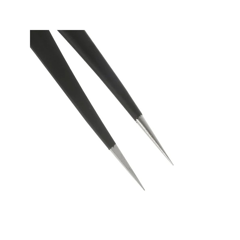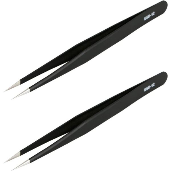 This ESD-12 straight tweezers are made of high quality stainless steel with anti static plating, has fine flat head tip, high precision and designed for needs of electronics such as holding small items and small parts.