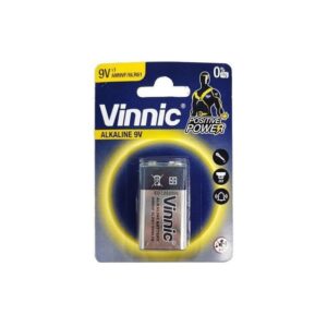 Vinnic 9V alkaline battery. Ideal for smoke detectors, remote controlled toys, cameras.